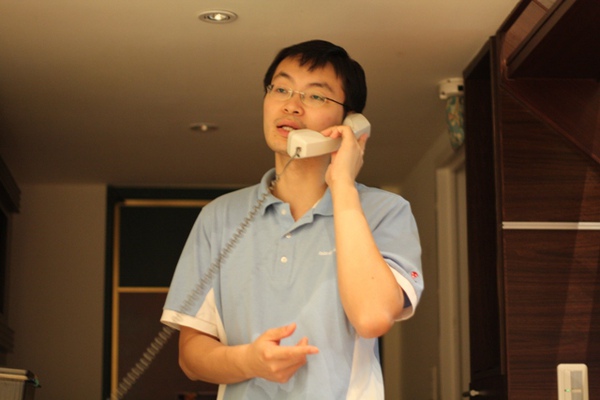 在我們家沒開玄關燈、只靠客廳燈光的玄關下接電話的王爸爸,