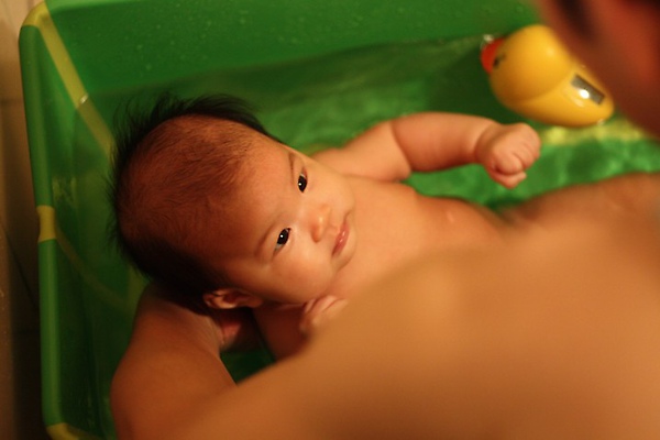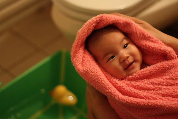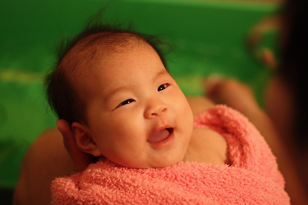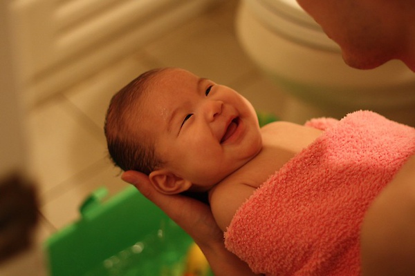 開箱完畢,先來洗頭吧,小蘋果笑的真開心!