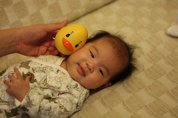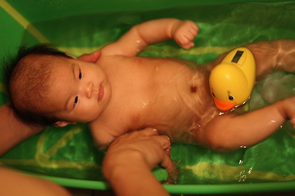 晚上小蘋果要洗澎澎時,趕緊把小鴨拿出來陪洗