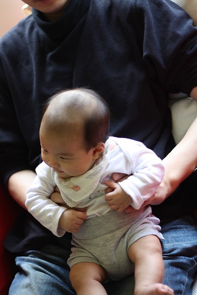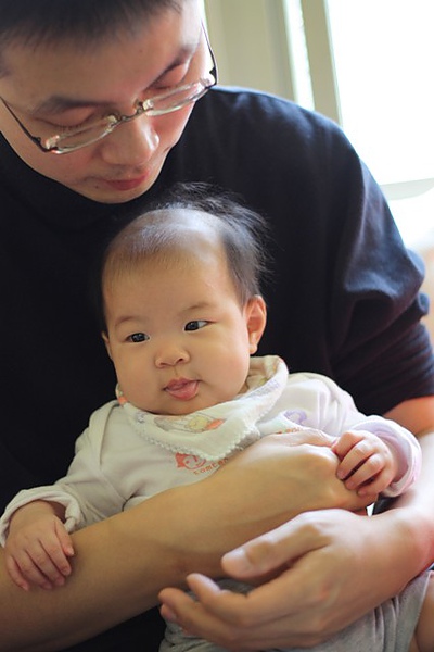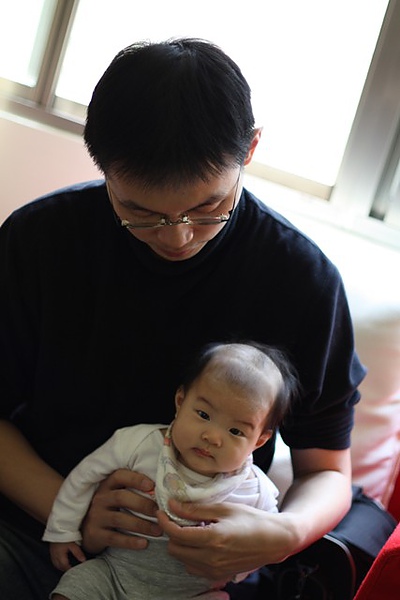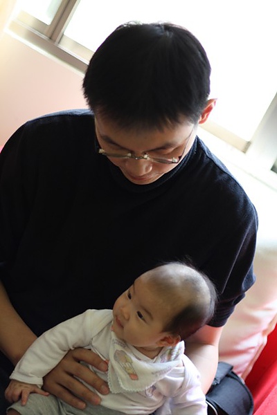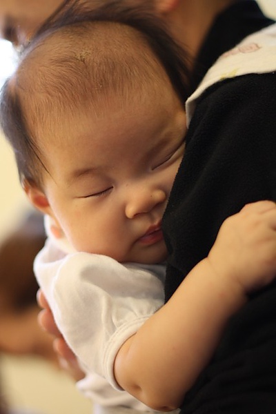蘋果已經舒服到在爸爸肩頭上深深的睡著了。