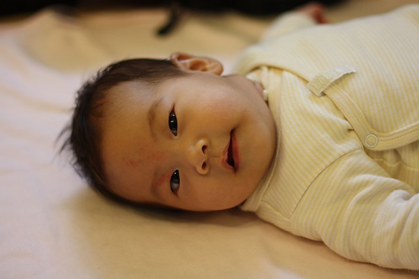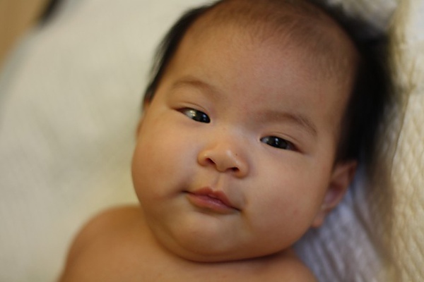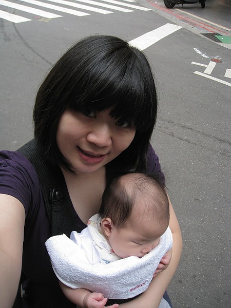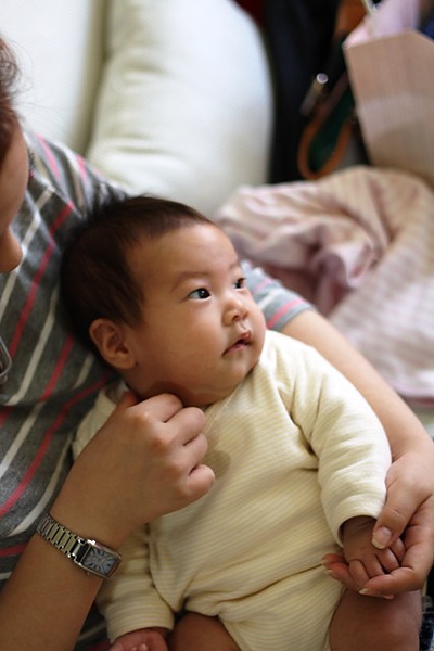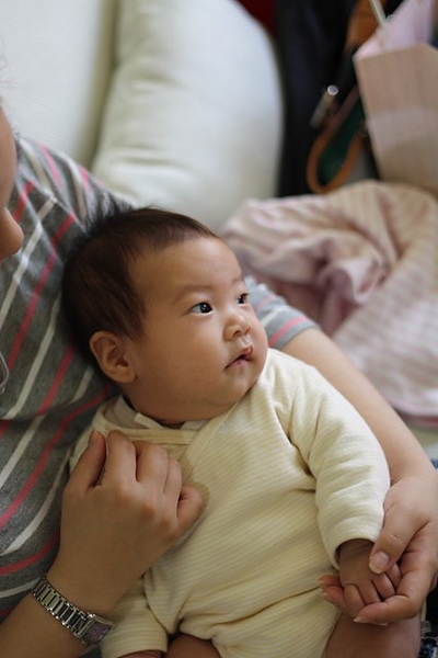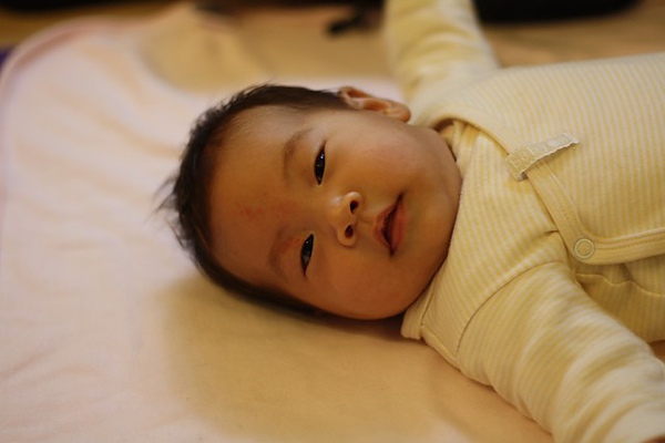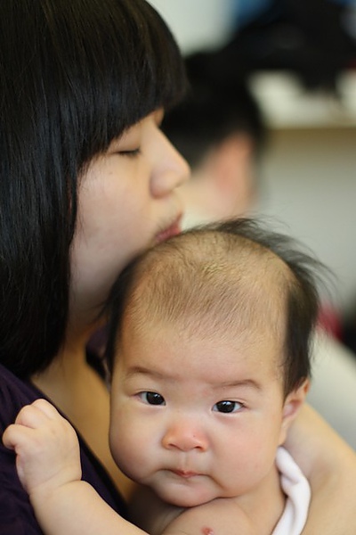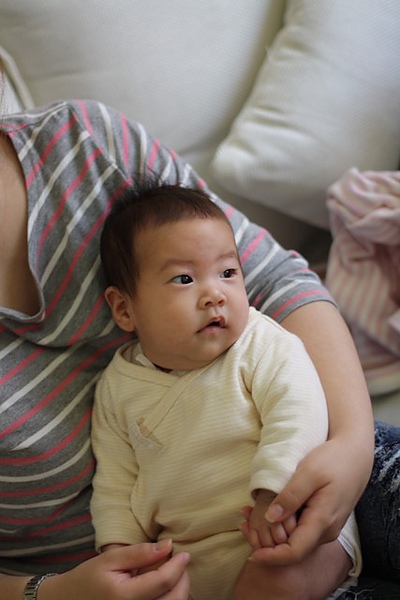 媽媽抱著光溜溜的小寶寶做放鬆呼吸:(蘋果,你也放鬆點好嗎?眼睛睜那麼大....)