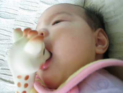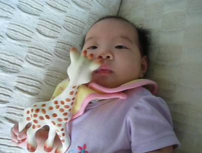 我就偶而會試著讓蘋果練習咬蘇菲長頸鹿。