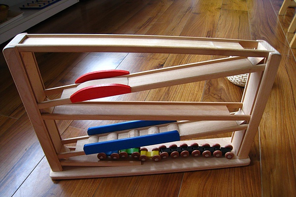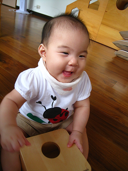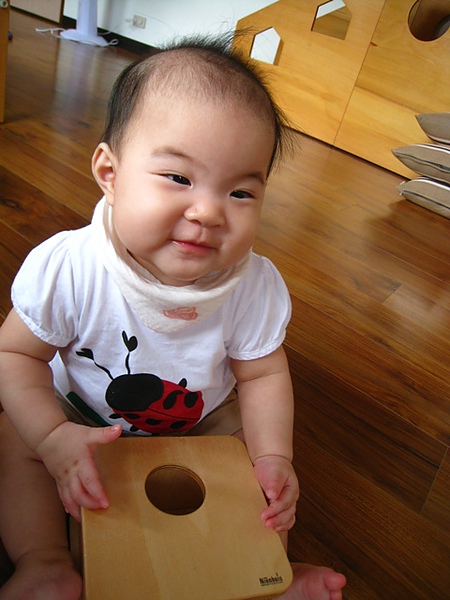 蘋果很喜歡這個木製的玩具,眼睛會追著那些小車車跑來跑去。