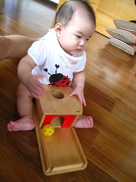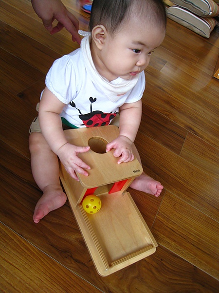 這是另一個玩具,可以訓練小朋友把黃色的球丟到洞裡面。