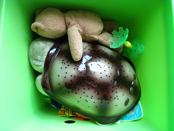 綠色的專門放軟質的玩具,包括固齒器、玩偶、布書、安撫巾和信誼小沙包...等。