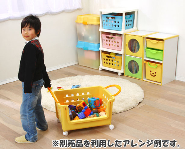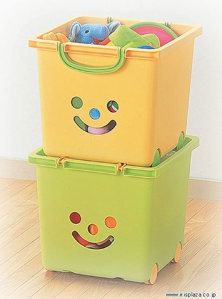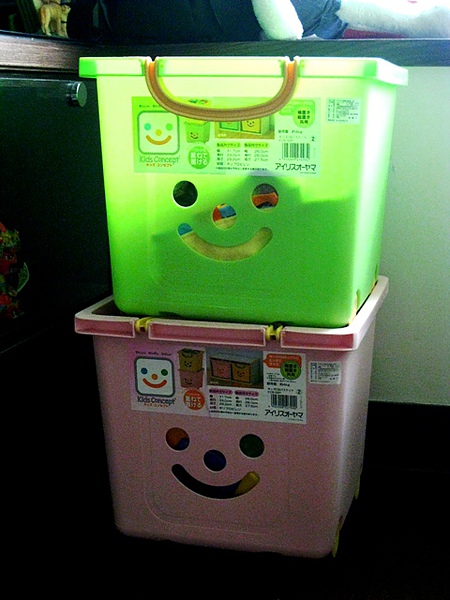 這就是我們買來的收納箱堆疊起來的樣子,有可愛的笑臉和方便推來推去的小輪子。
