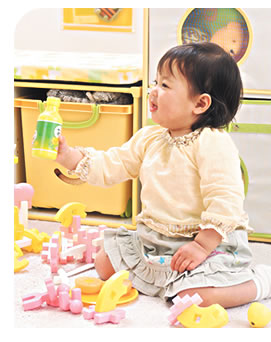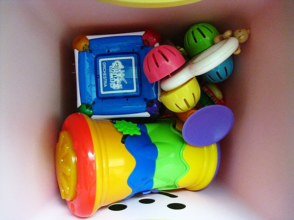 粉紅色則放硬質的玩具,像爬行鼓、莫札特方塊、手搖鈴和餐盤玩具...等。
