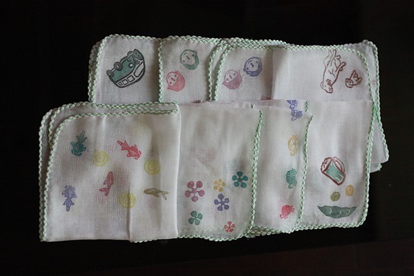 是以蘋果媽自己手刻的橡皮擦印章、日本進口的布用印泥加工製作。