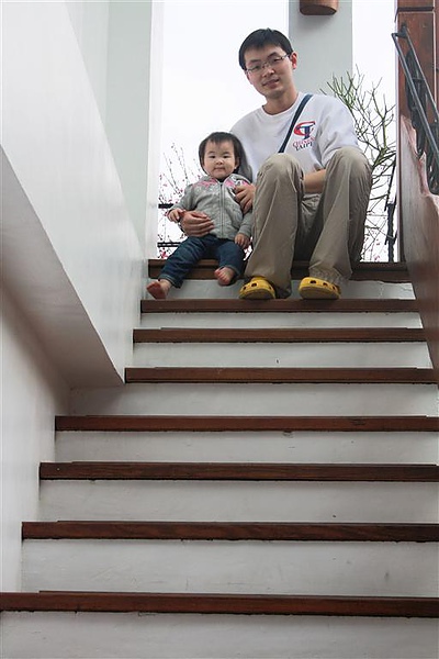 蘋果和爸爸坐在梯廊外欣賞著美麗的風景,