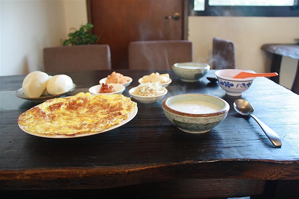 一大盤現煎的蔥花蛋,清粥小菜、鮮奶饅頭,還有熱牛奶與咖啡,
