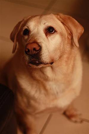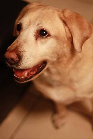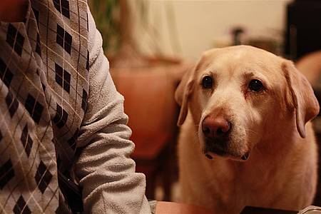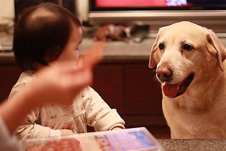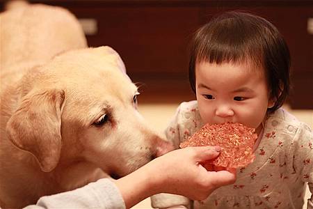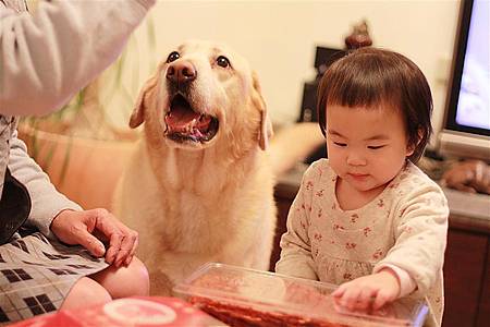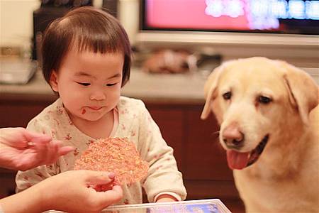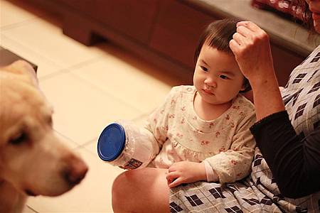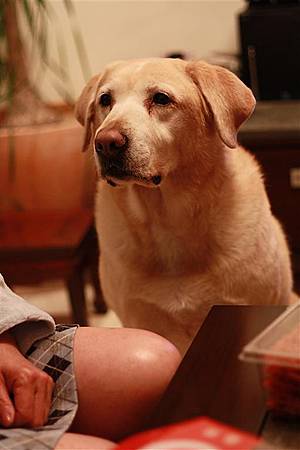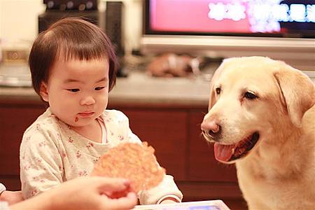 阿公在吃餅乾,拉不拉多弟弟在旁邊饞的要命,