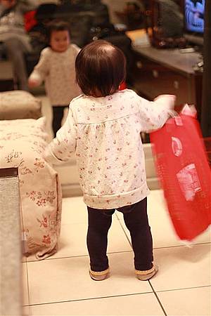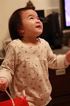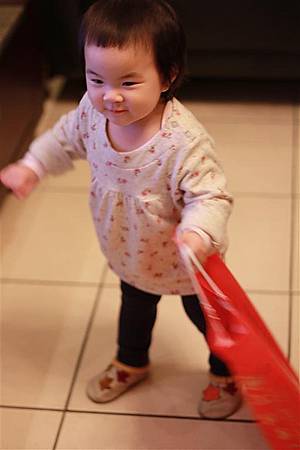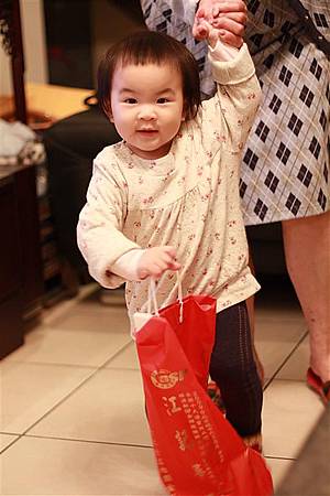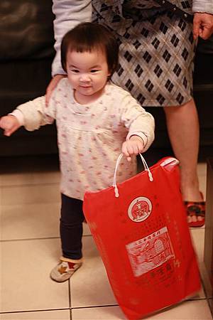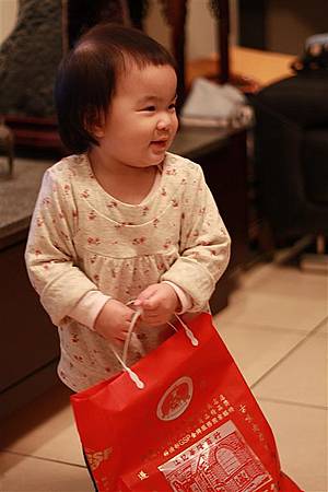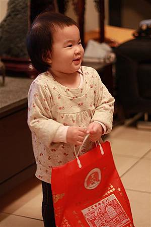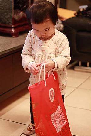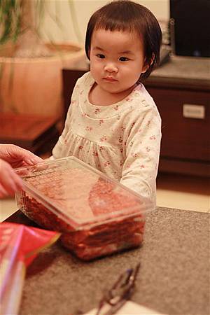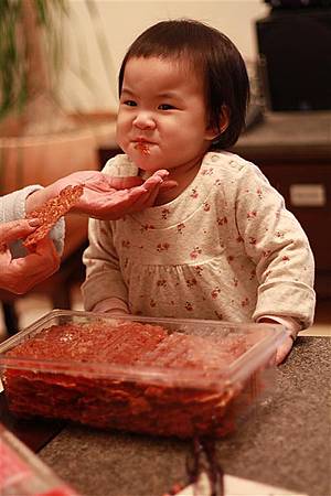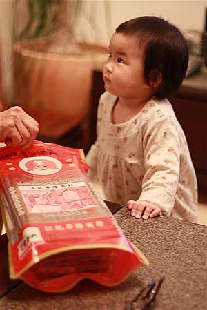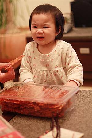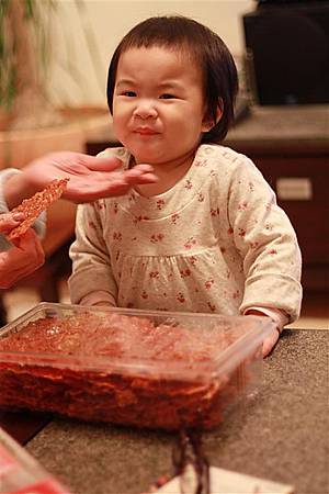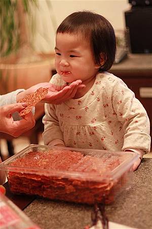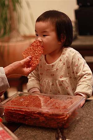 阿嬤拿豬肉乾,蘋果一直看著阿嬤,