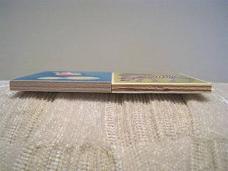吉律的木製拼圖是上面加一層紙,再用亮光漆把圖案封在木片上,