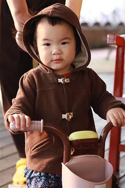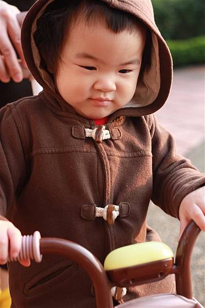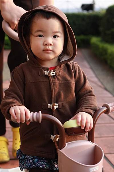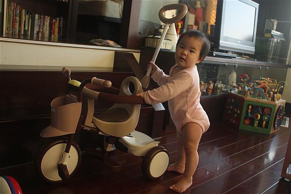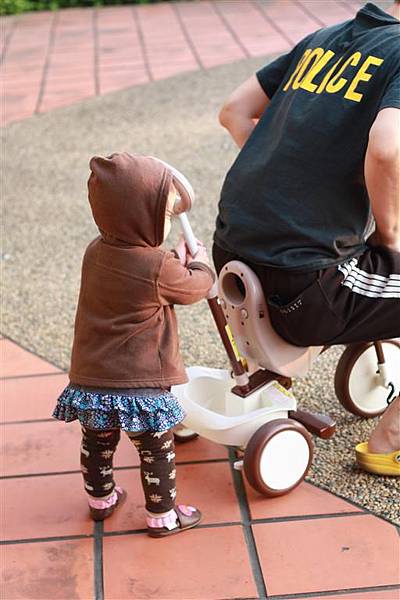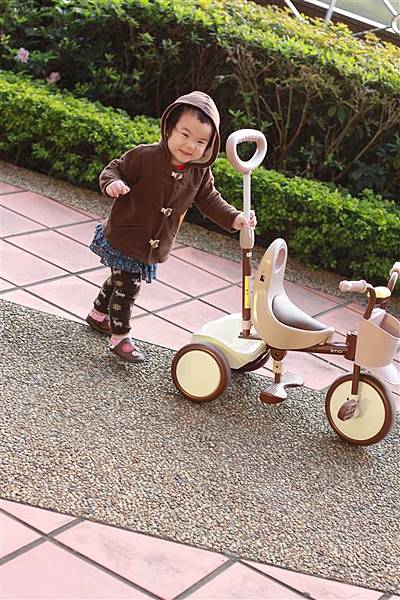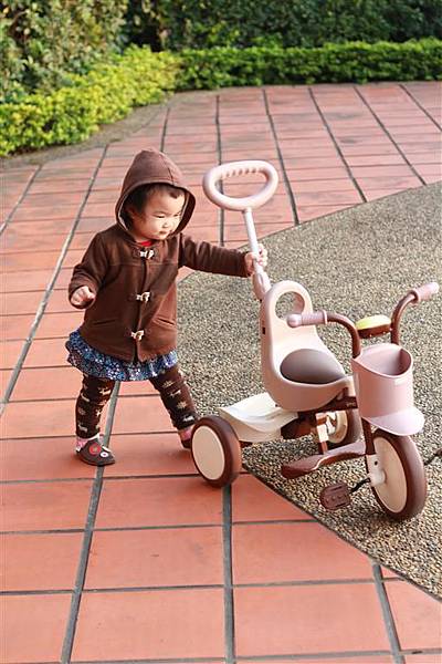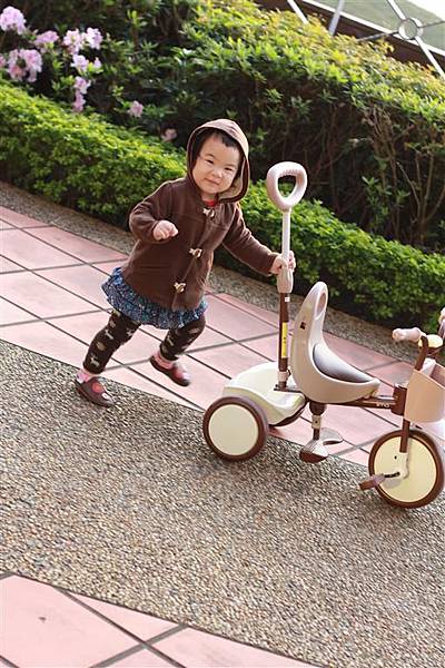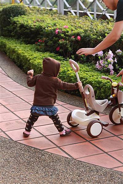 大概是看爸爸媽媽這樣推著三輪車,所以自己也想推著三輪車走,