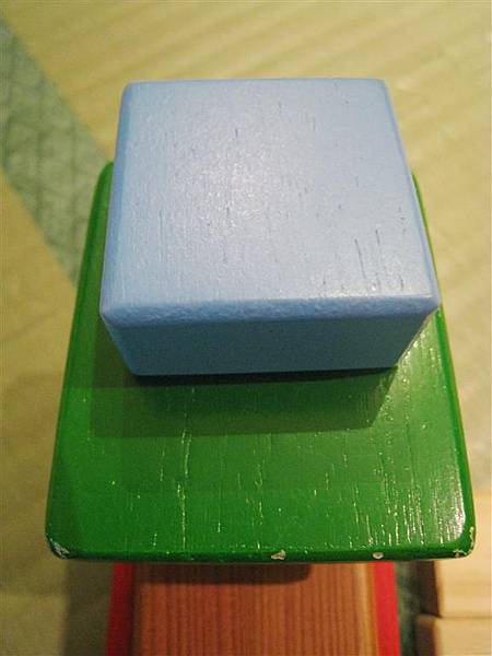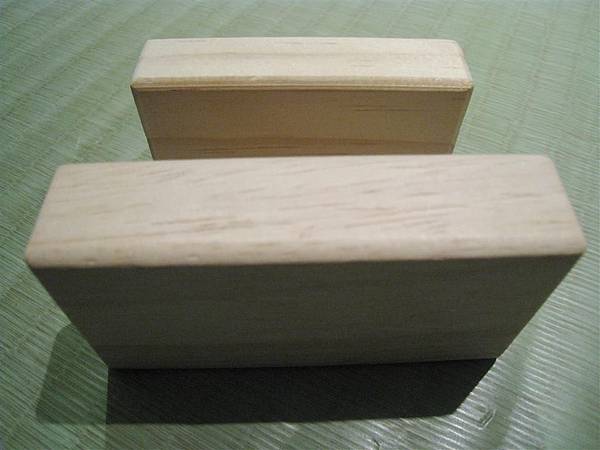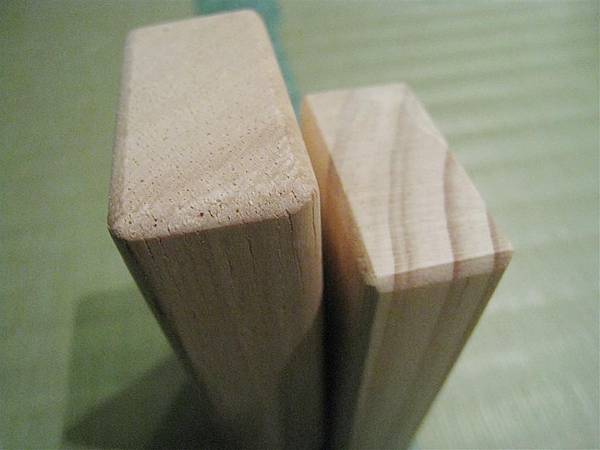 很明顯可以看出班恩傑尼的積木表面有些烘乾過程中產生的小孔洞,而一元積木則是木紋明顯,
