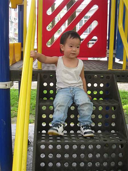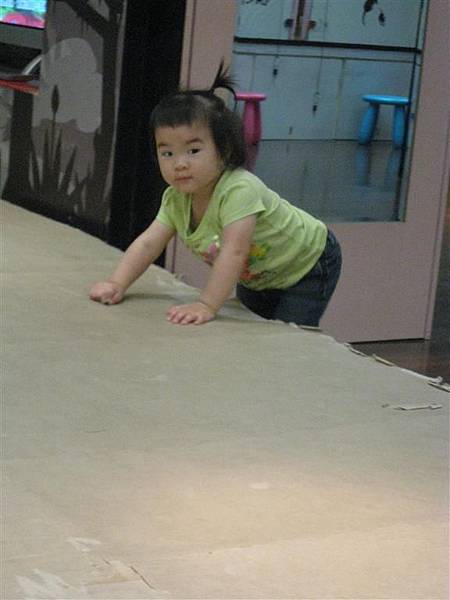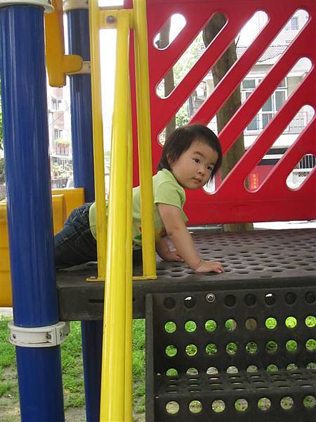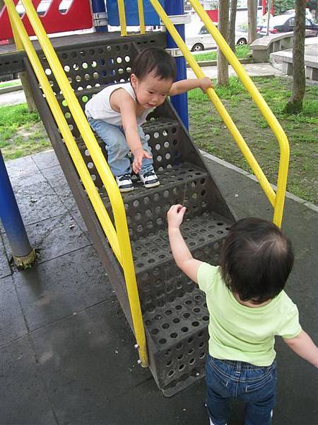 蘋果一開始覺得陌生不敢爬,看小哥哥玩的很開心,她也跟著爬去溜滑梯,