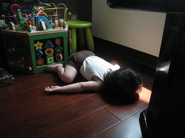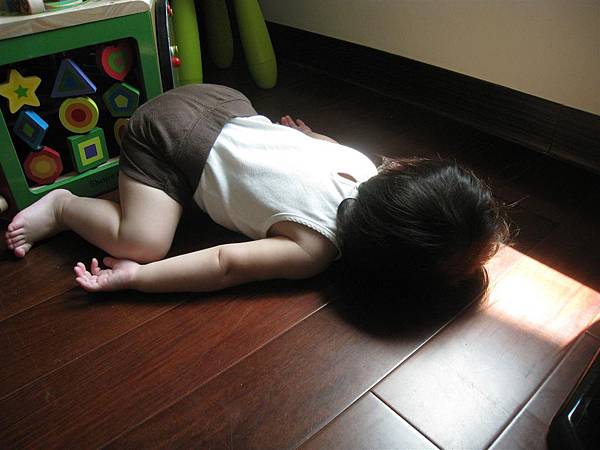 他竟然在窗台前面有陽光的地方,就這樣趴在地上享受曬太陽的感覺,