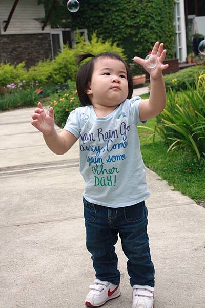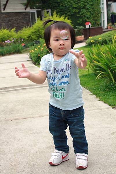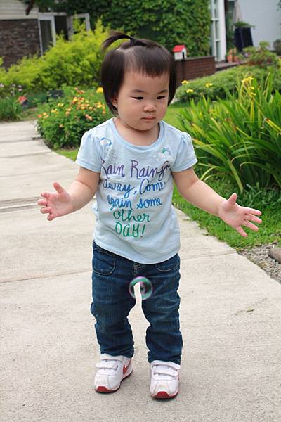 蘋果好專心的看著爸爸吹出來的泡泡,