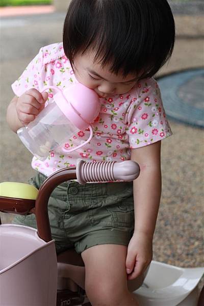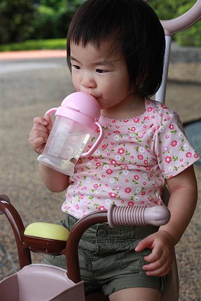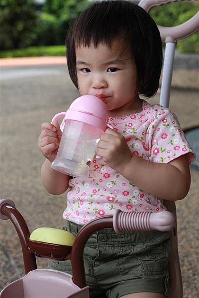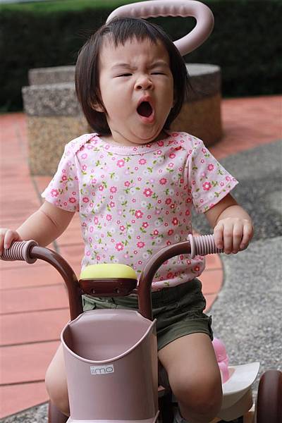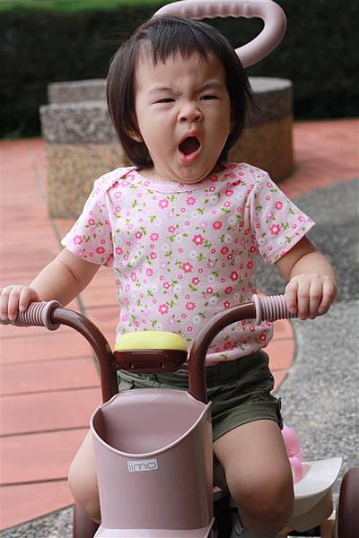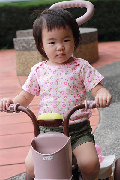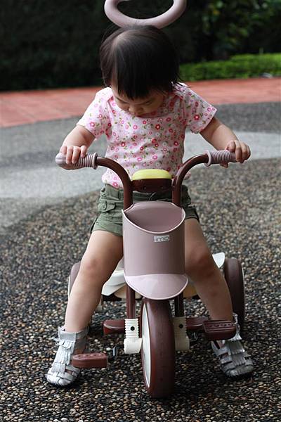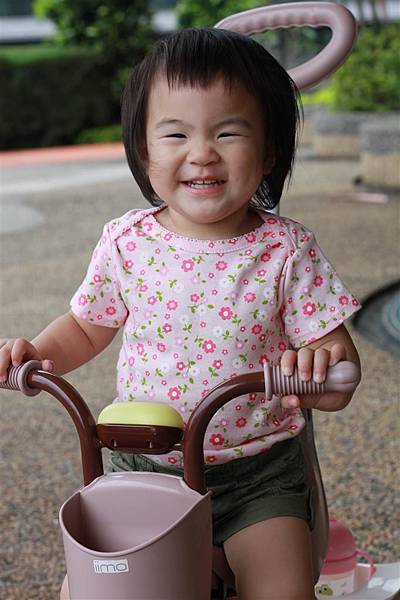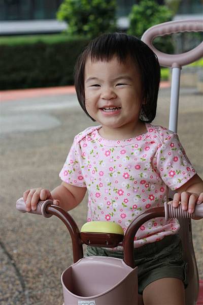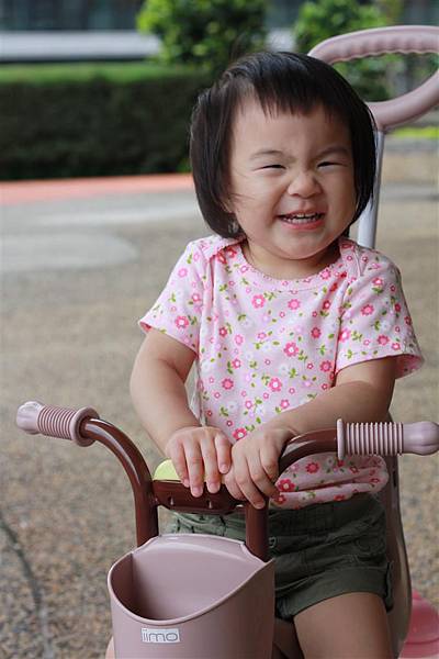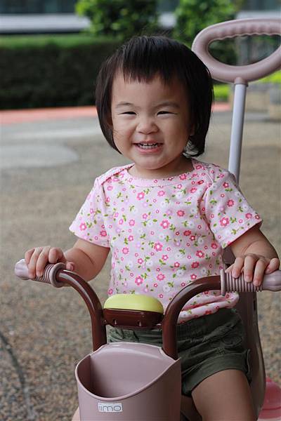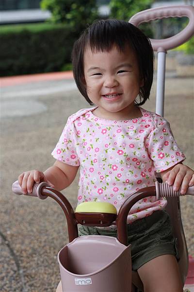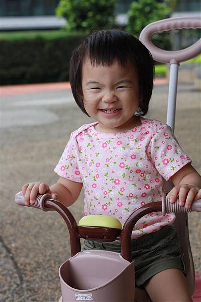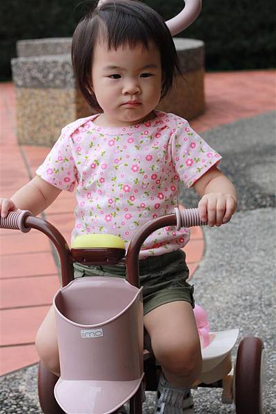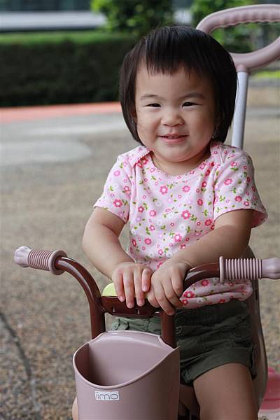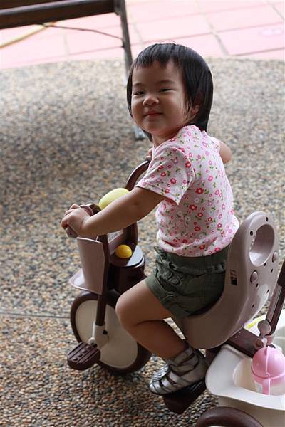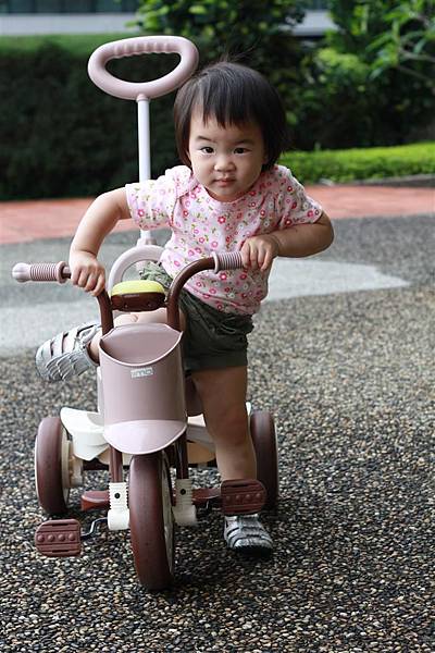 回頭看看前天帶蘋果去中庭騎三輪車的照片吧!這姿勢看起來腿好長啊!