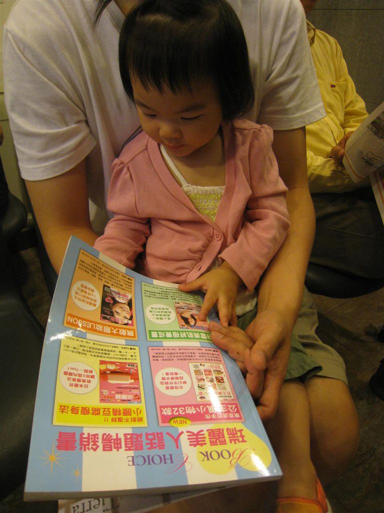 這小傢伙坐在爸爸的腿上,專心的看著書,