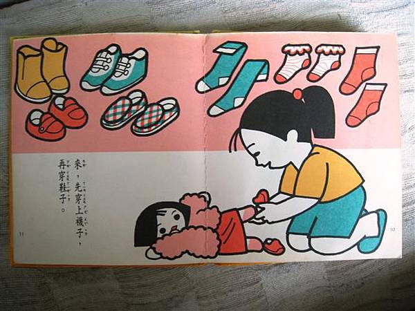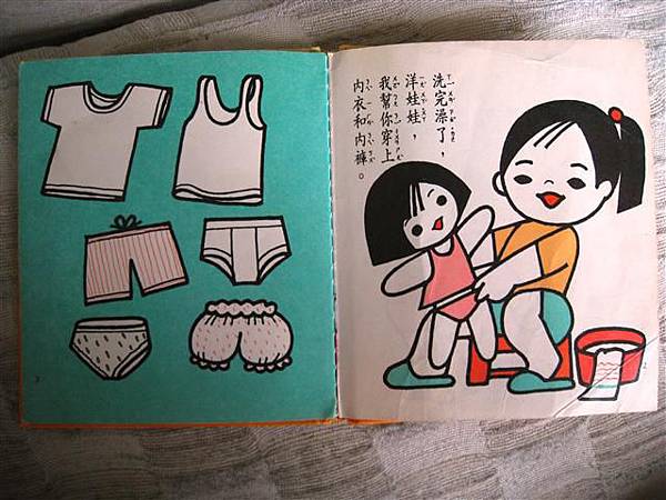 這本書的用意是讓孩子藉由幫洋娃娃穿衣服來了解各種衣物的穿戴順序與差異,