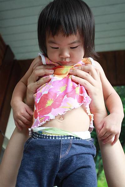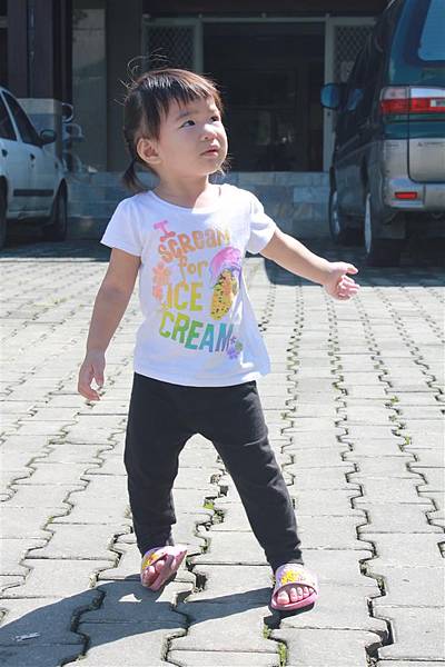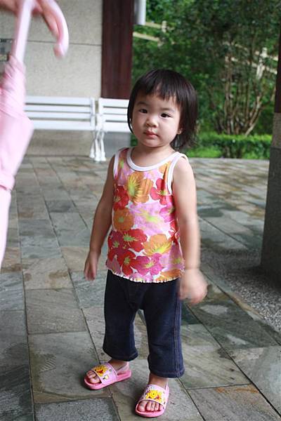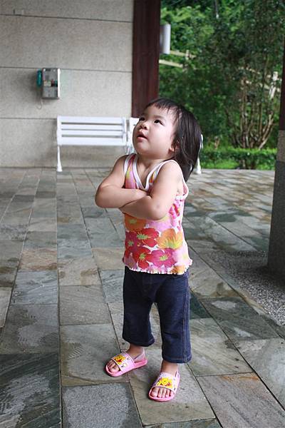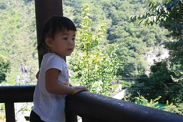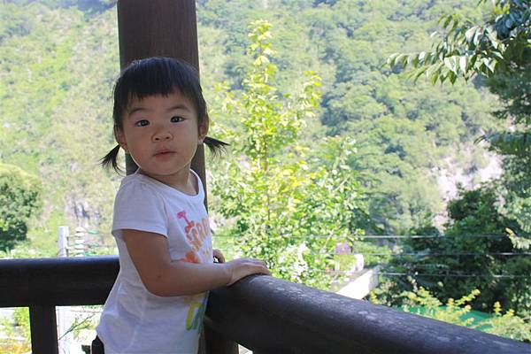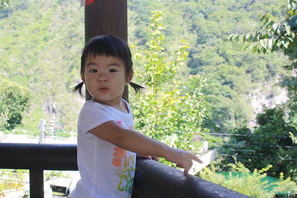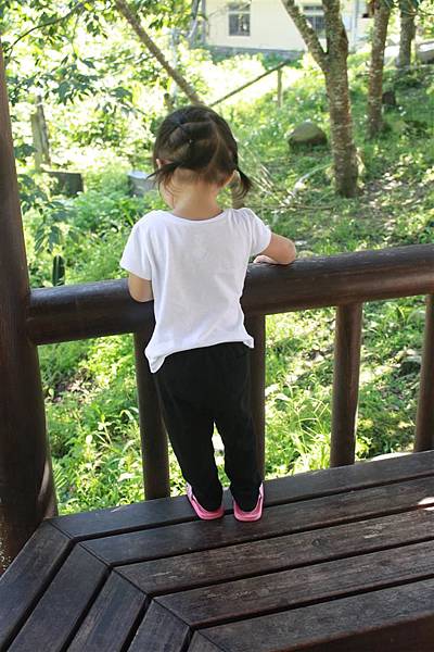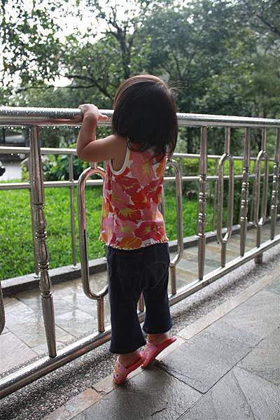雨剛停的山莊邊,這個小女孩很頑皮的墊腳尖看風景,