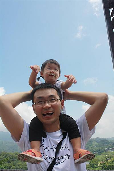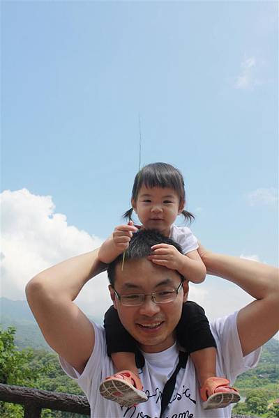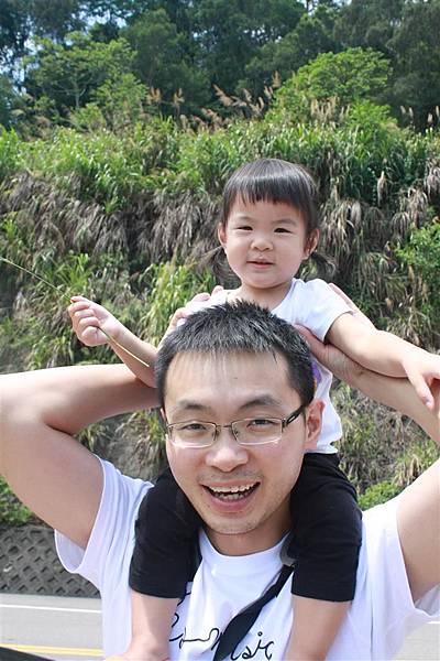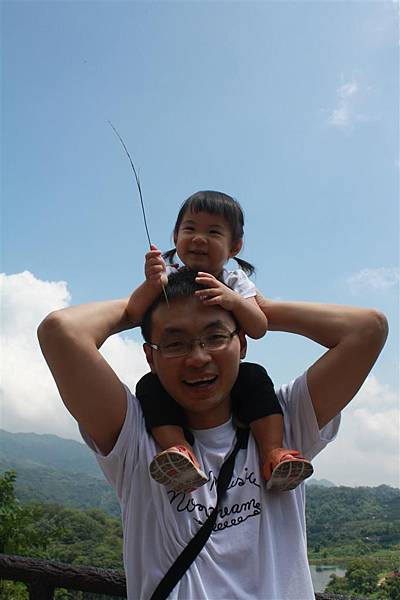 蘋果隨地撿起一隻小樹枝,坐在爸爸肩頭,