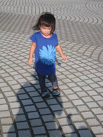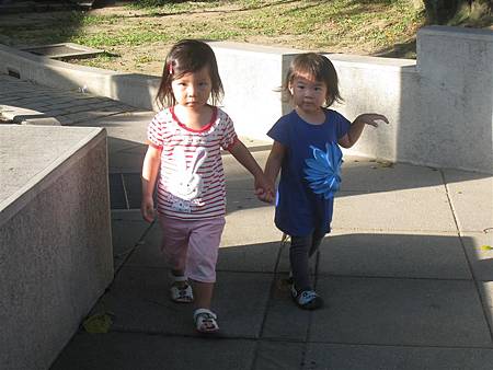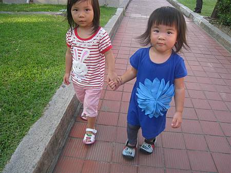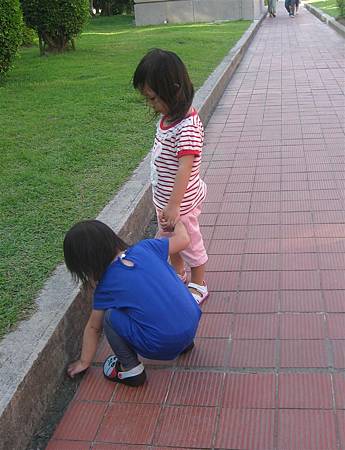 發現路邊有小石頭,姐姐等蘋果蹲下來撿,手還牽的緊緊的。
