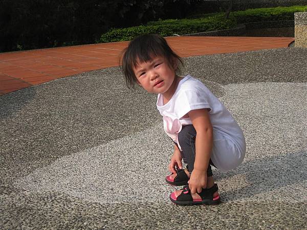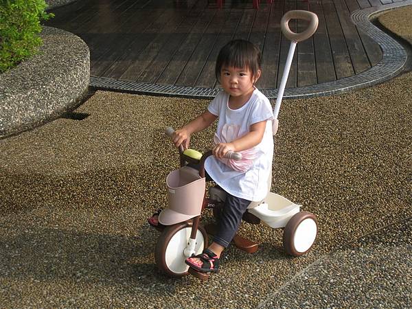然後不想踩要媽媽推,媽媽推了一陣子不推了,她就生氣啦~哈哈哈