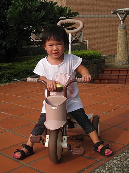 她開始騎在三輪車上用力跺腳、大哭重複喊著不要不要!