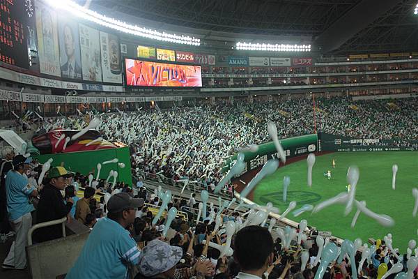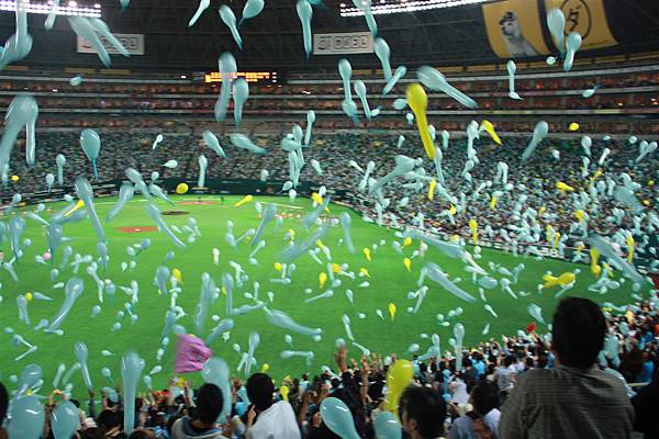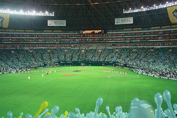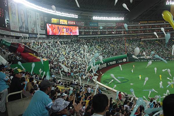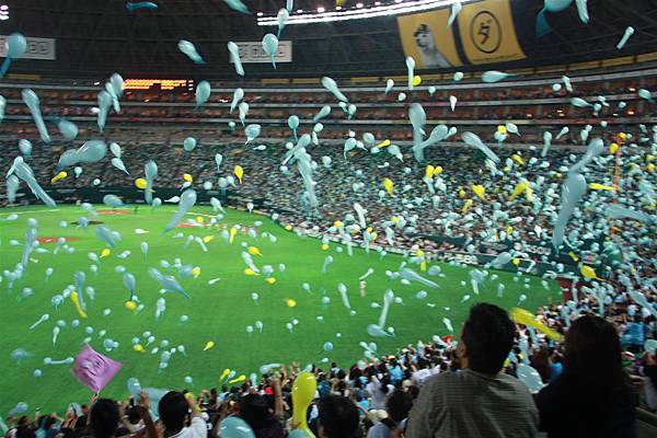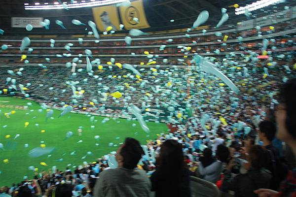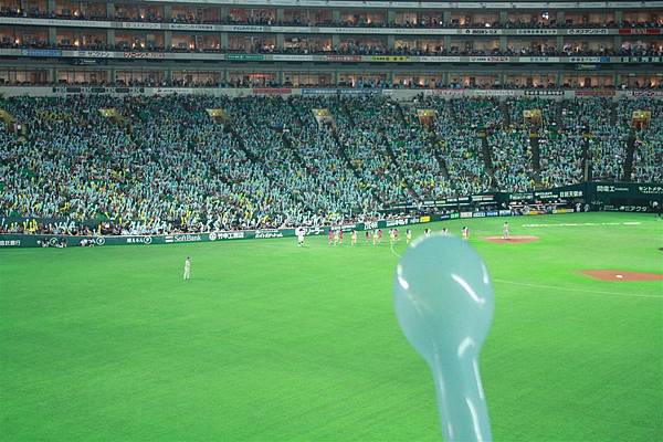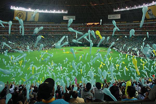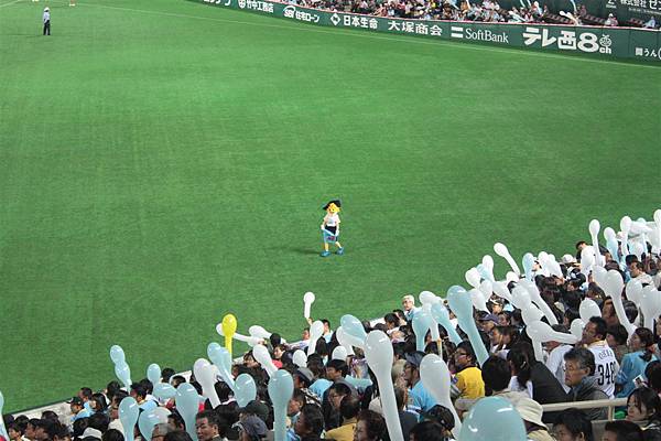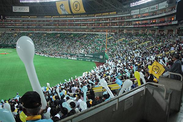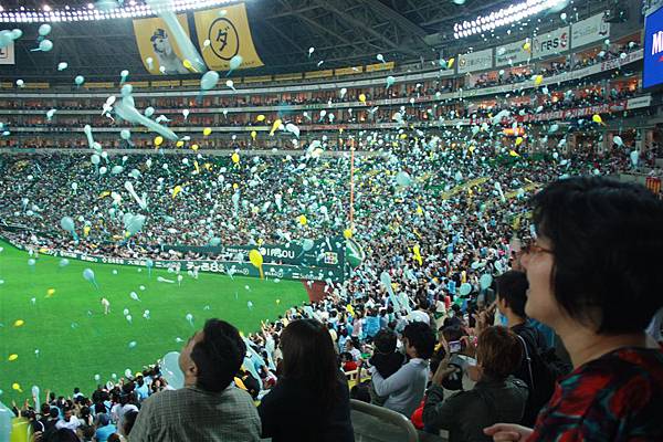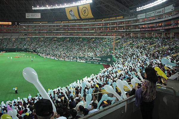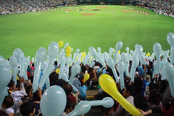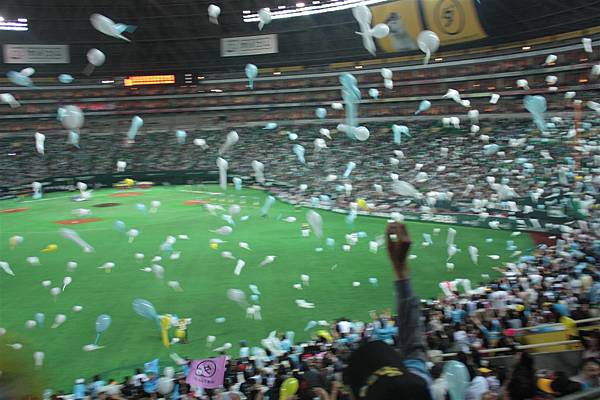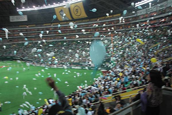 比賽到第九局,軟體銀行五比零領先,大家開始吹起白色汽球準備放汽球瞜~