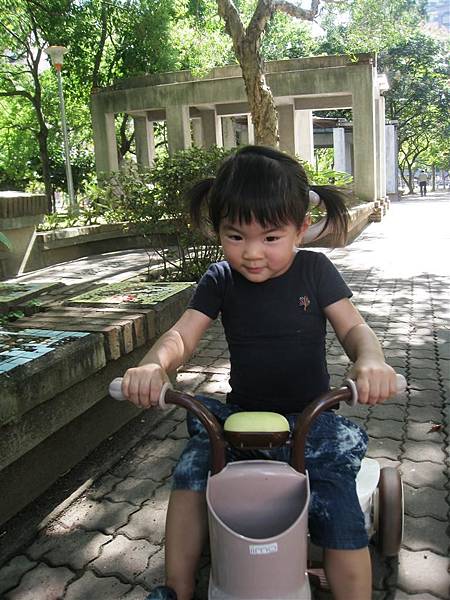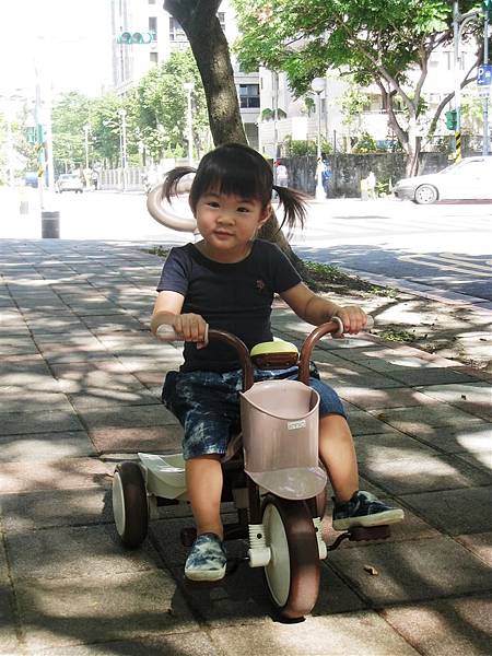 頂多只是告訴她可以把腳放在腳踏上踩,剩下都是她自己摸索學習的,左右轉彎亦然。