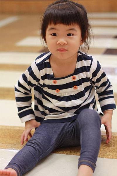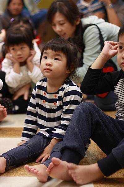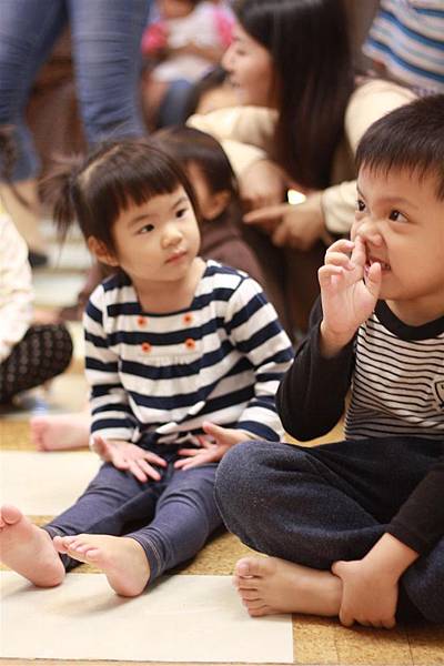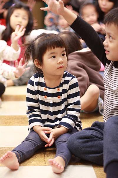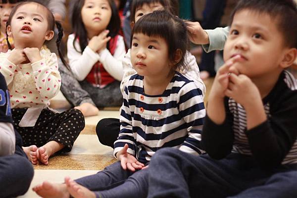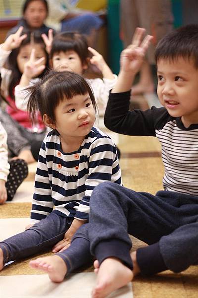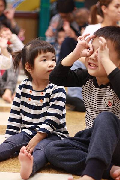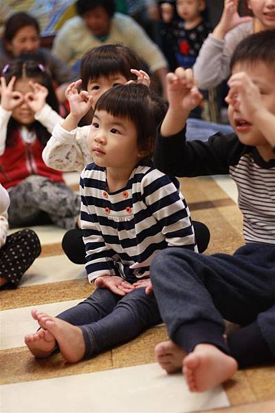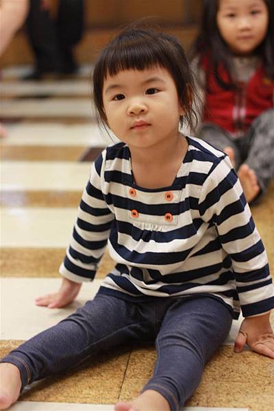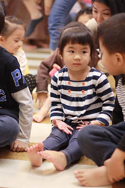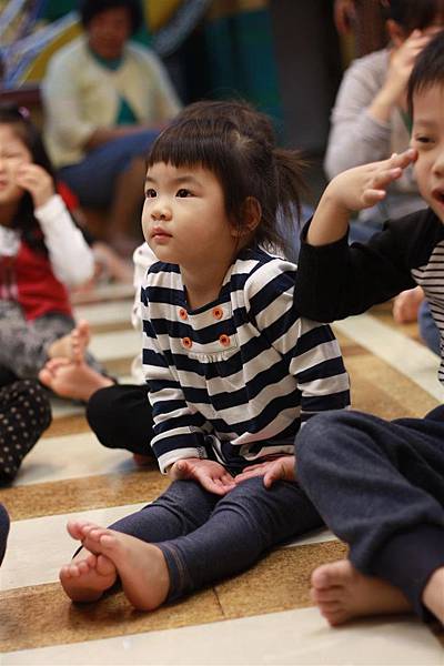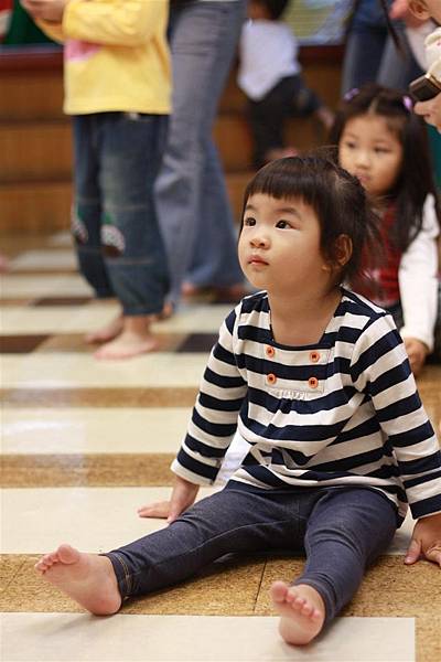 蘋果一聽到我說律動時間要開始了,立刻乖乖跑到大球池前面的空地坐好。