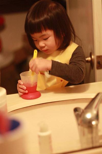 乖乖的讓我幫她挽起袖子、穿上圍兜兜,免得弄得一身衣服都濕拎拎的。