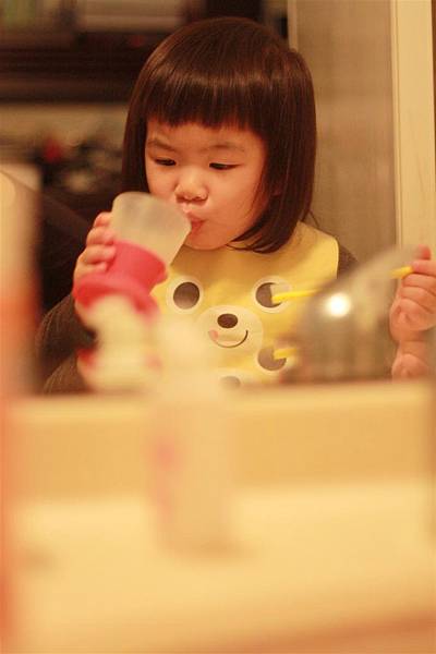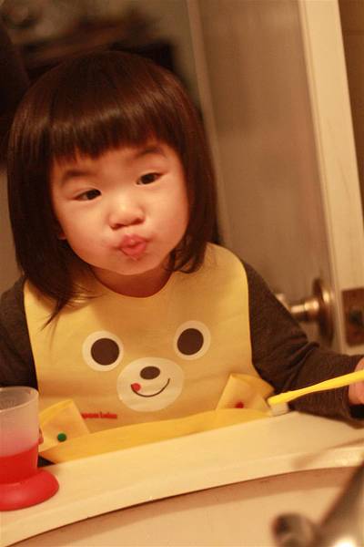 有時候漱口還會對著鏡子嘟個嘴,讓我跟蘋果爸都笑暈了,
