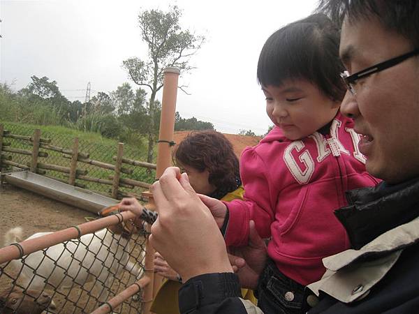 爸爸引導著蘋果餵羊吃東西,