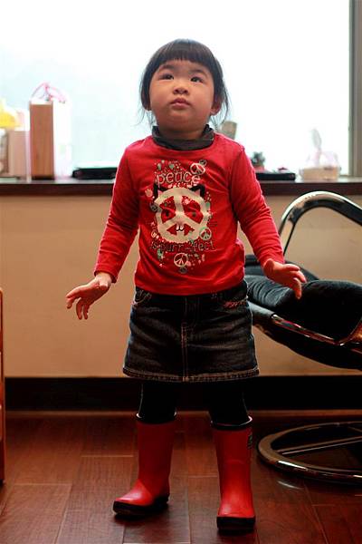 配上紅色滾藍邊的雨鞋,真是超搭的啦!