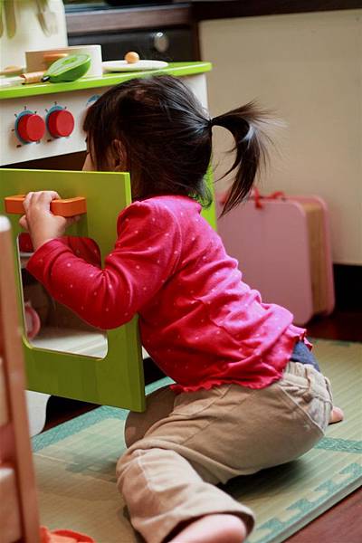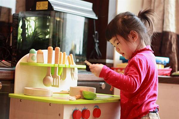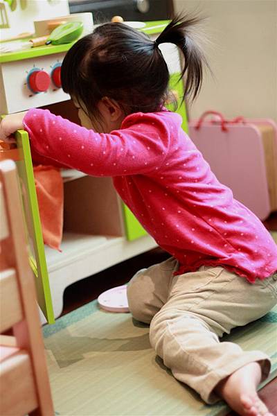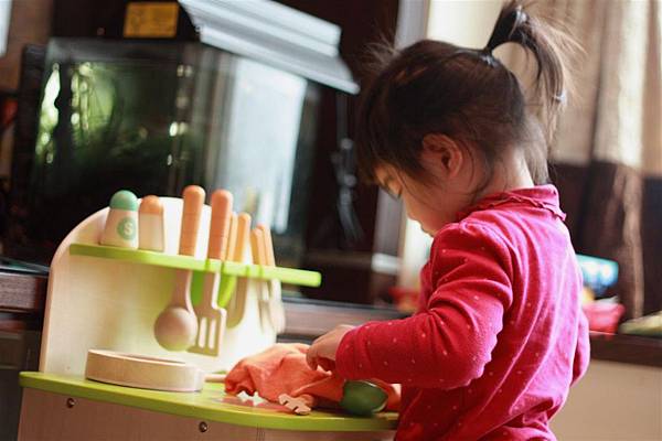 她也會用廚房玩具組附上的橘色抹布四處擦她的廚具,