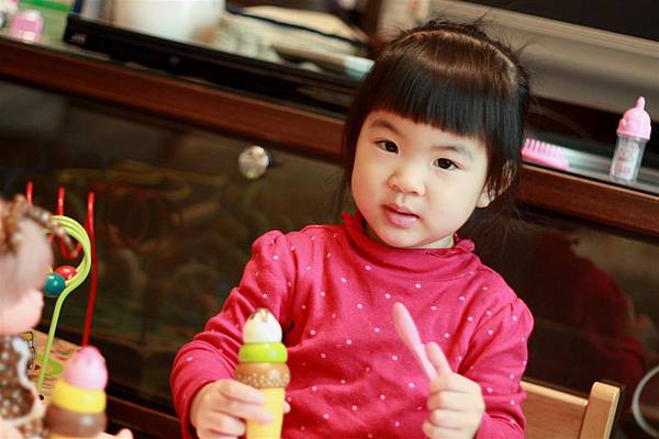 學媽媽拿湯匙挖冰淇淋跟妹妹一起分享,