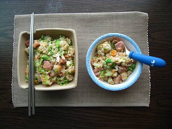 那生米煮成熟飯,再加上香腸的香味、切碎成丁的蘿蔔乾、雞蛋豆腐,