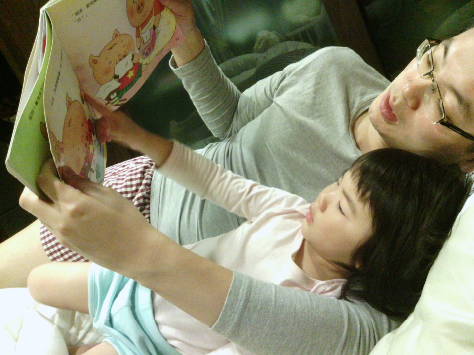 蘋果枕著爸爸溫暖寬厚的手臂胸膛,自己挑幾本故事書,跟爸爸一起互動講故事。