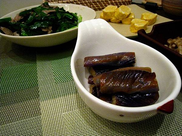今日晚餐韭菜炒肉片、日式鹹口味玉子燒、醃茄子、涼拌什錦菇