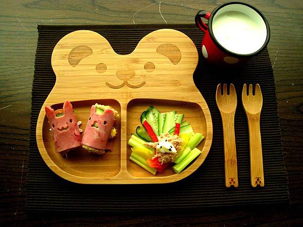 蘋果媽特地幫蘋果做了一組可愛的火腿三明治與鮪魚沙拉來搭配這組可愛的餐盤,