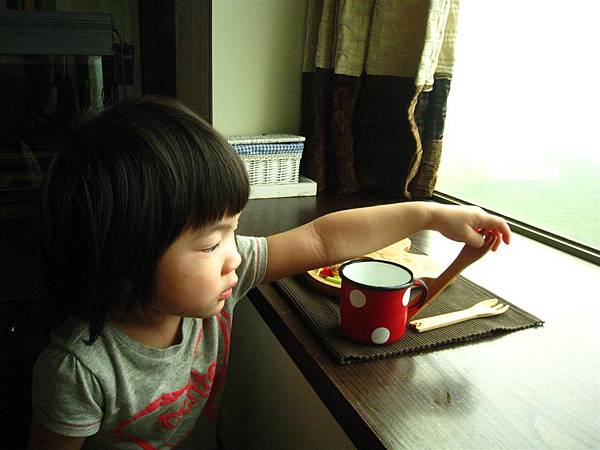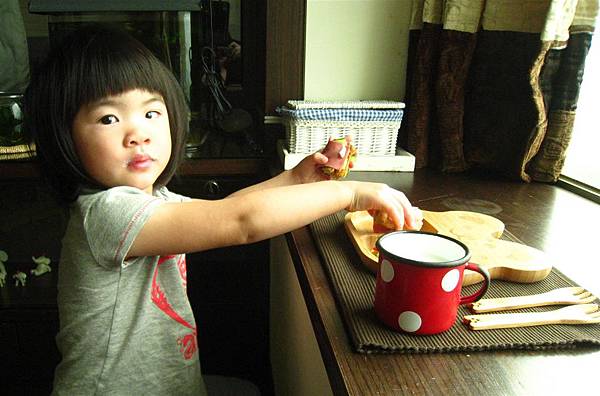 再搭配上可愛的紅色水玉琺瑯杯裝牛奶,是不是超愜意的早餐風情呢~