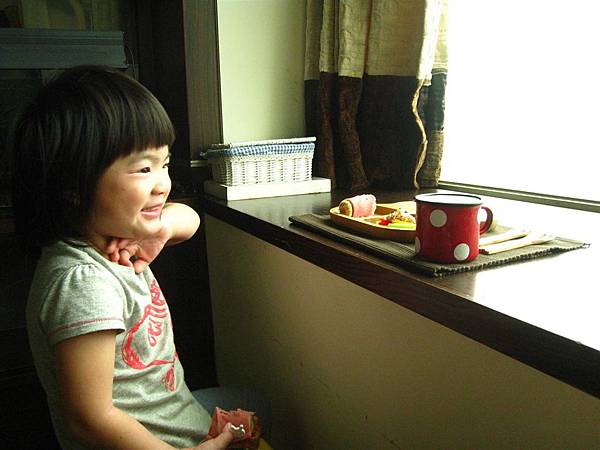 直接坐在我們家窗台邊吃早餐喝牛奶,