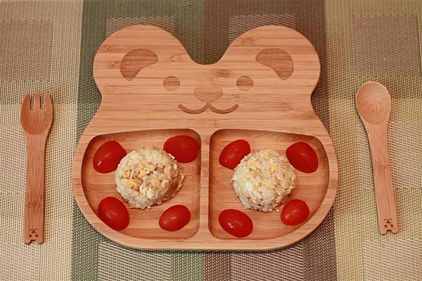 午餐則是用小熊餐盤來吃鮪魚炒飯和番茄,