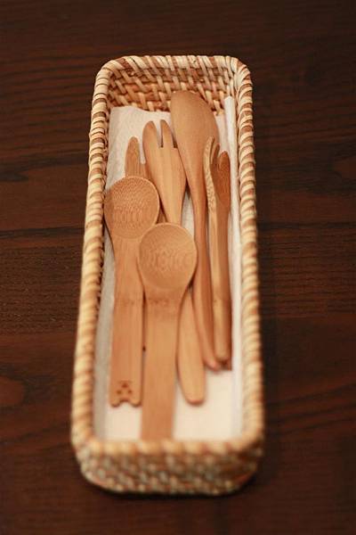 蘋果媽平常會把所有木製竹製的餐具洗淨擦乾後放在一個竹編的通風餐具盒裡,