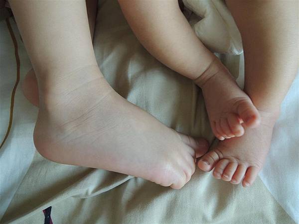 蘋果最喜歡把自己的腳丫丫放在妹妹的小腳旁邊說:我的腳比較大、妹妹的腳比較小。