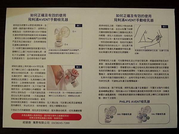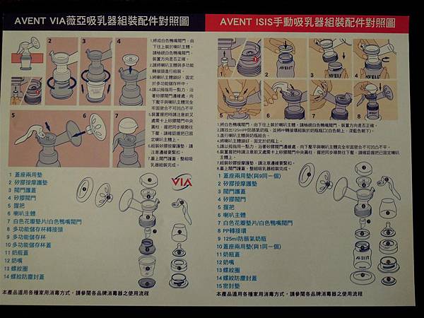 中文保固卡裡還附上一張詳細的雙面說明書,包括組裝配件對照圖及使用吸乳器的說明: