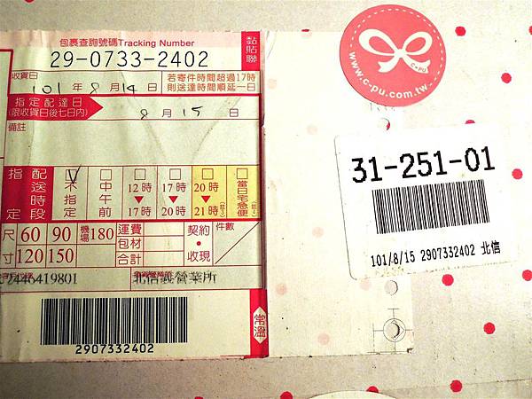 連宅配單據上都貼了一枚小張的蝴蝶結貼紙,超可愛的啦!